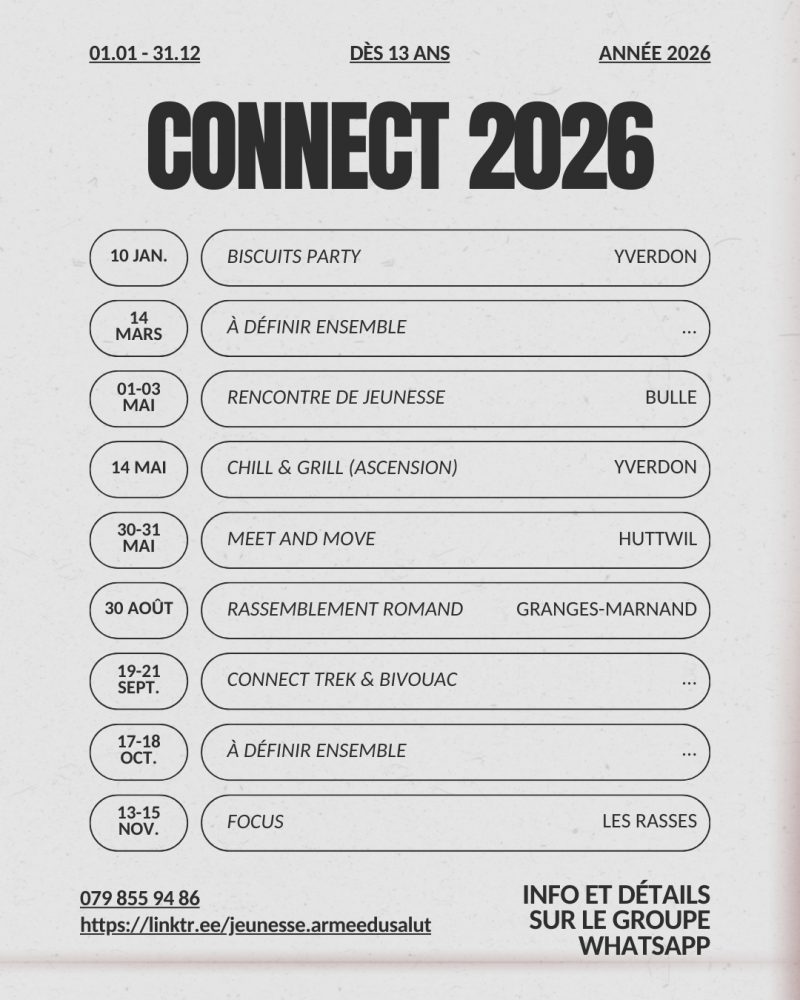 Connect, ce sont des rencontres régulières (toutes les 6-8 semaines), spontanées et variées pour tous les jeunes et moins jeunes (13-30ans). Le but est de se retrouver, de rester connecter, de passer du bon temps ensemble et de s’encourager dans la foi.